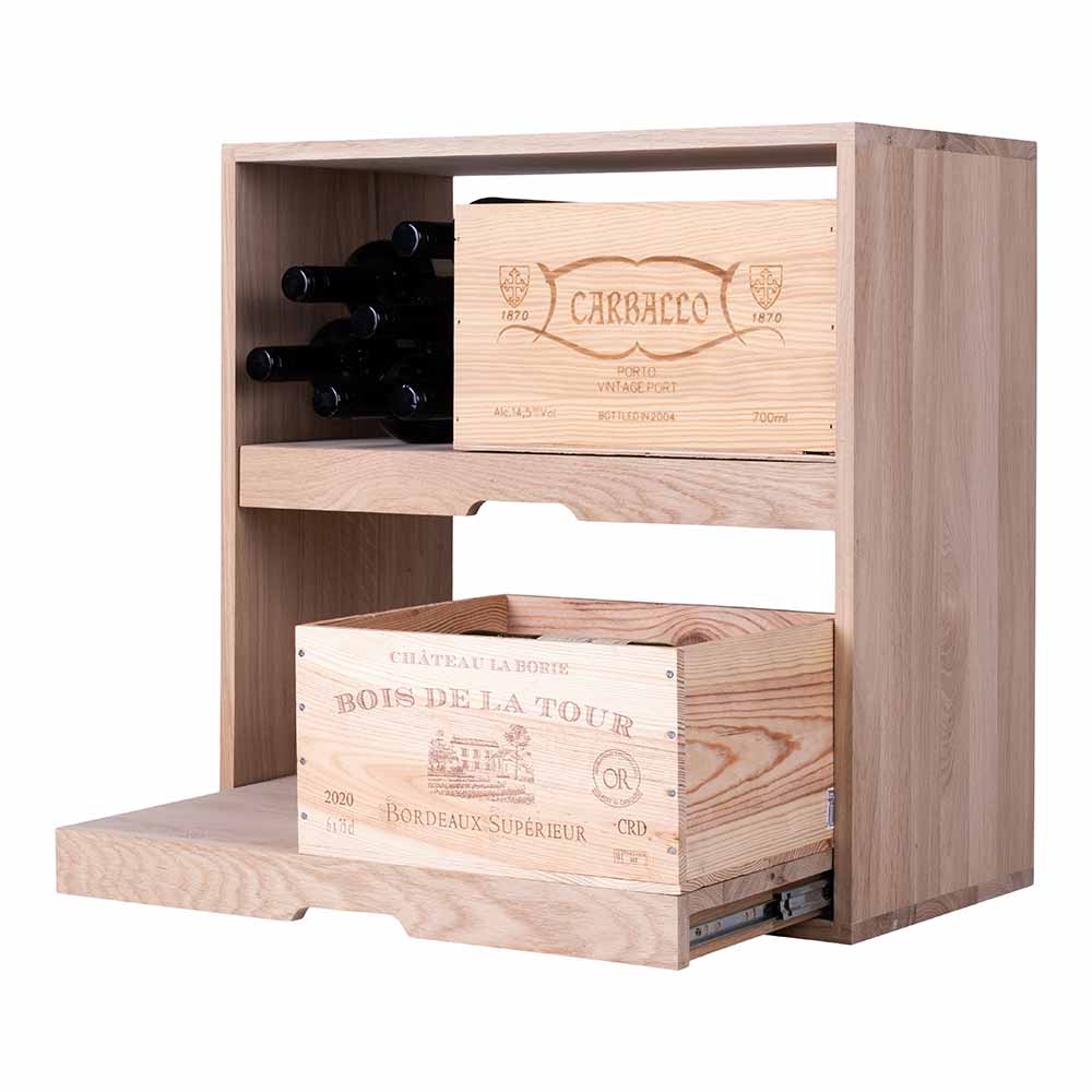 Kombination aus Weinkartons und Flaschen. Abmessungen: 60x60x30 cm (Höhe x Breite x Tiefe) mit Massivplatten, die 1,5 cm dick sind. Der Preis ist pro Modul (Inneres und Rahmen). Das Material ist Eichenholz.